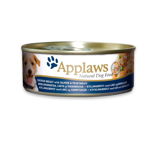 Pechuga de pollo 28%, caldo de pollo 26%, salmón 17%, calabaza 8%, zanahoria 8%, guisante verde 8%, arroz 5%.
