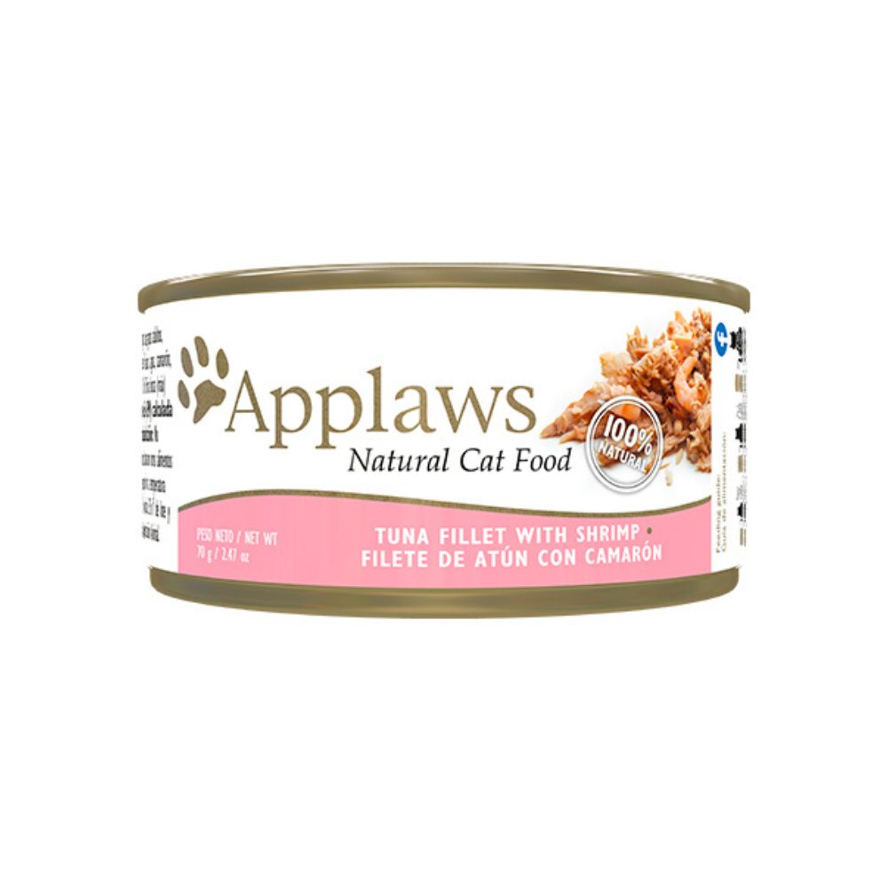 Alimento húmedo para gatos. Contiene 75% filete de atún con camarón.