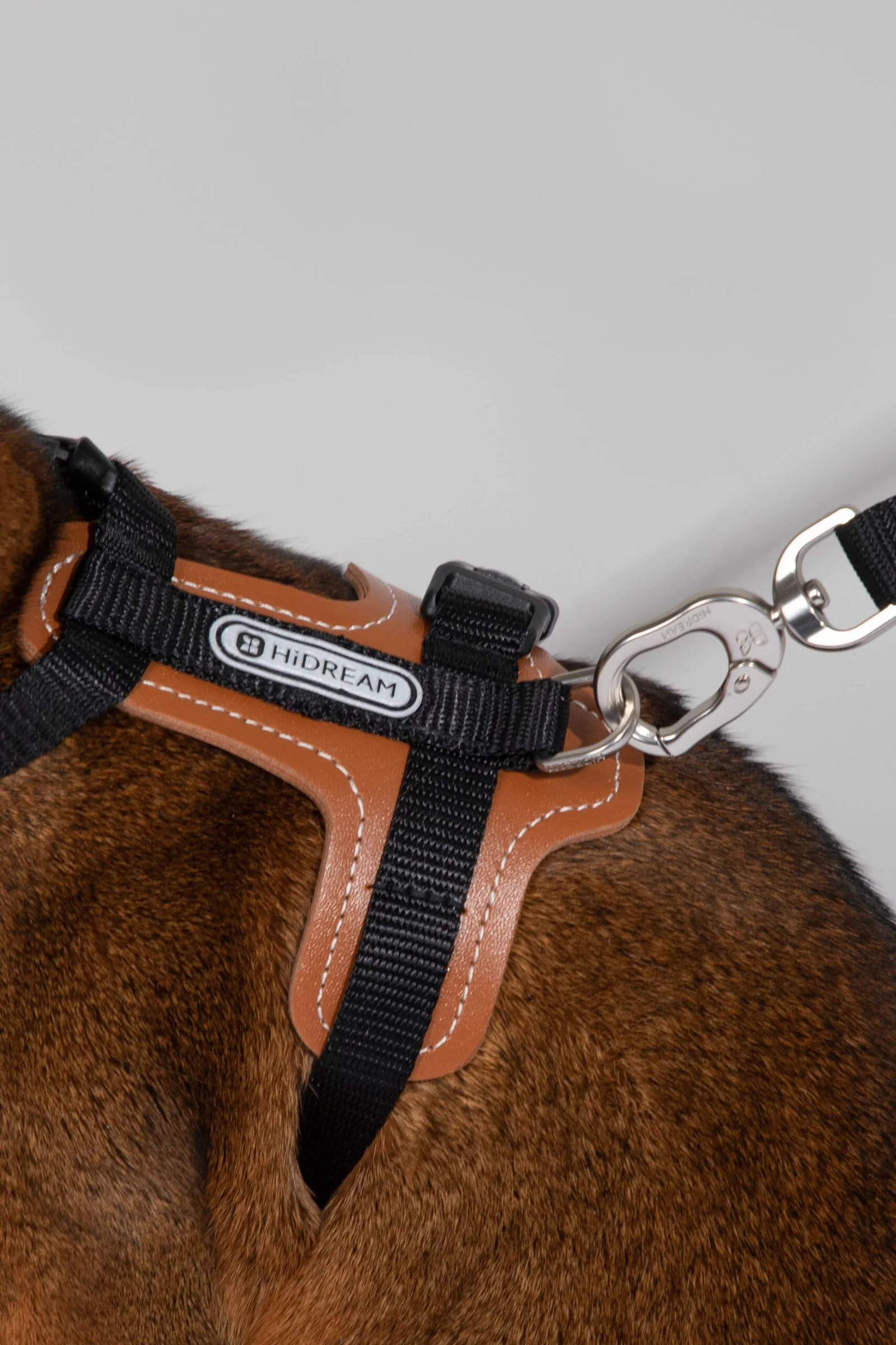 Incluye un sistema de cierre resistente y un ajuste trasero que garantiza que el arnés se mantenga en su lugar. Además, el diseño del material de cuero ofrece mayor durabilidad y resistencia durante los paseos.