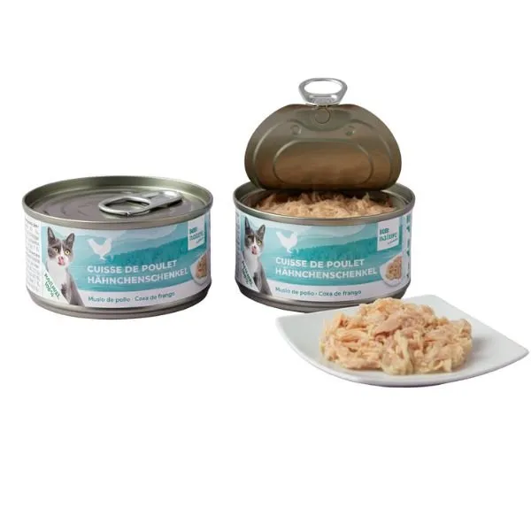 Deliciosa receta elaborada con muslo de pollo 100% natural. Textura suave y digestible, ideal para gatos sensibles o que prefieren sabores más suaves. Fórmula limpia y alta en proteína.