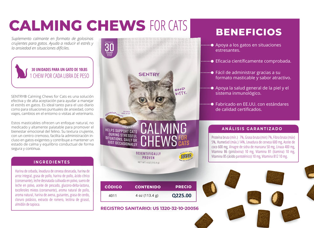 Dale a tu gato un estado de calma y bienestar con Calming Chews – la solución práctica y deliciosa para el manejo del estrés felino.