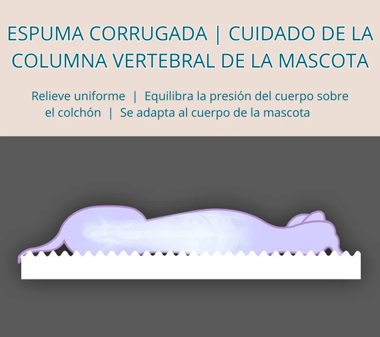 Colchón de espuma de alta densidad tipo “huevo”, ayuda a distribuir el peso de forma uniforme, aliviando la presión sobre las articulaciones y mejorando la calidad del descanso. Ideal para mascotas senior o con necesidades articulares.