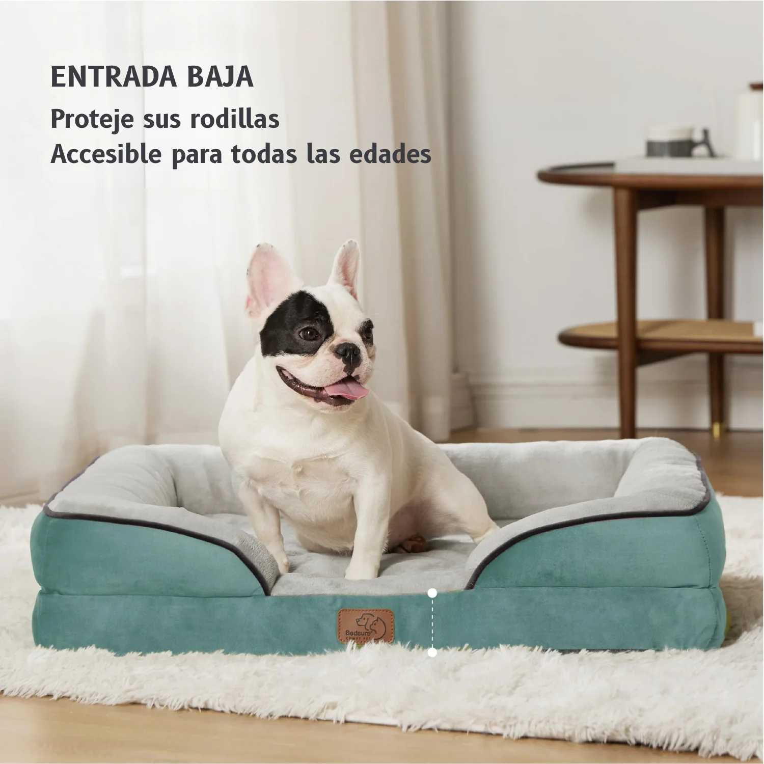 Sus bordes elevados brindan soporte adicional para la cabeza y el cuello, aportando una sensación de seguridad y comodidad. La entrada frontal rebajada facilita el acceso, especialmente para perros mayores o con movilidad reducida.