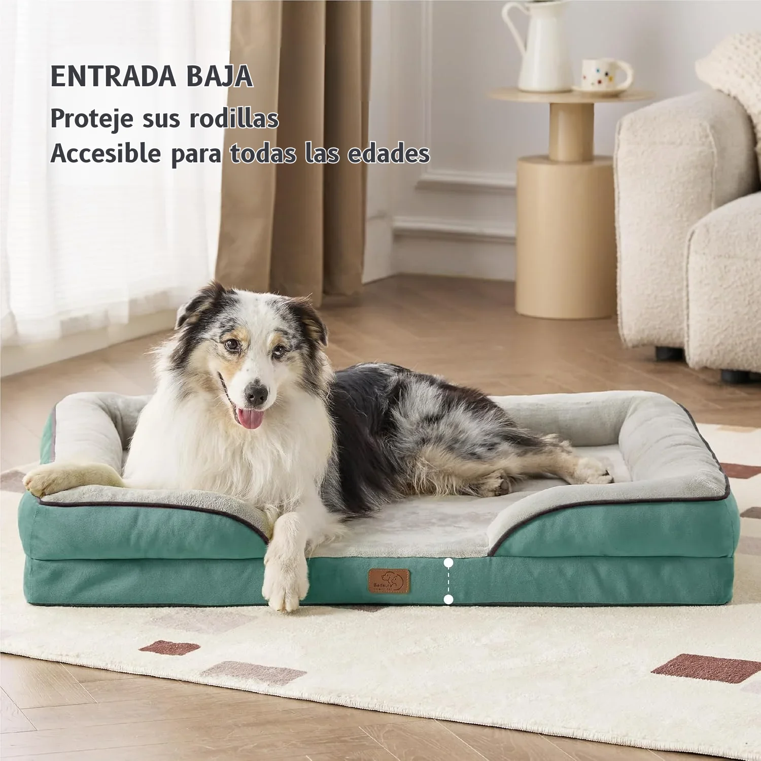 Sus bordes elevados brindan soporte adicional para la cabeza y el cuello, aportando una sensación de seguridad y comodidad. La entrada frontal rebajada facilita el acceso, especialmente para perros mayores o con movilidad reducida.