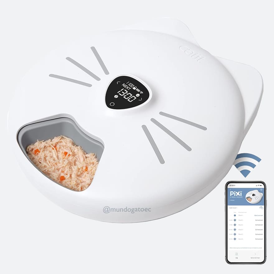 - Tan inteligente como tu gato: Catit PIXI – Alimentador inteligente es un comedero para gatos PIXI de 6 comidas te permite alimentar a tu gato hasta 6 comidas variadas por día, totalmente adaptadas a su patrón de alimentación. Solo necesitas cargar la bandeja con porciones saludables de la selección preferida de alimentos secos, húmedos o golosinas de tu gato, y el comedero servirá sus comidas diarias según lo programado en la aplicación gratuita Catit PIXI.