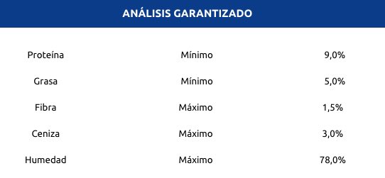 Pasta de pollo, agua (suficiente para el proceso), carne de pollo, harina de trigo, aceite de pollo, proteína concentrada de soya, extracto de levadura saccharomyces cerevisiae, carragenina, cloruro de sodio, cloruro de colina, perejil deshidratado, goma guar, carbonato de calcio, hierro quelado, sulfato ferroso, hidroxicloruro de zinc, zinc quelado, beta-glucanos, selenio quelado, cobre básico cloruro, cobre quelado, yodato de calcio, hidroxicloruro de manganeso, manganeso quelado, selenito de sodio, vitamina E tocoferol acetato, vitamina B3 niacinamida, vitamina B5, vitamina A retinol, vitamina H biotina, vitamina B2 riboflavina, vitamina K3 menadiona, vitamina B12 cianocobalamina, vitamina B1 tiamina, vitamina B6 piridoxina, vitamina D3 colecalciferol, vitamina B9 ácido fólico, sales de ácido propiónico, tocoferoles, aceite de romero, ácido cítrico, color amarillo N°5, taurina.