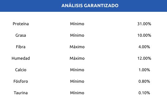 Harina de pollo, arroz cristal, pollo, aceite de pollo, mogolla de trigo, hidrolizado hígado de pollo, celulosa, cloruro de sodio, manano-oligosacaridos, bisulfato de sodio, hierro quelado, sulfato ferroso, hidroxicloruro de zinc, zinc quelado, selenio quelado, cobre básico de cloruro, cobre quelado, yodato de calcio, hidroxicloruro de manganeso, manganeso quelado, selenito de sodio, taurina, vitamina E tocoferol acetato, vitamina A retinol, vitamina B1 tiamina, vitamina B2 riboflavina, vitamina B3 niacinamida, vitamina B5 ácido pantoténico, vitamina B6 piridoxina, vitamina B9 ácido fólico, vitamina B12 cianocobalamina, vitamina H biotina, vitamina K3 menadiona, vitamina D3 colecalciferol, fosfato dicálcico, azufre, extracto de yuca schidigera, sales de ácido propiónico, tocoferoles y aceite de romero, ácido cítrico..