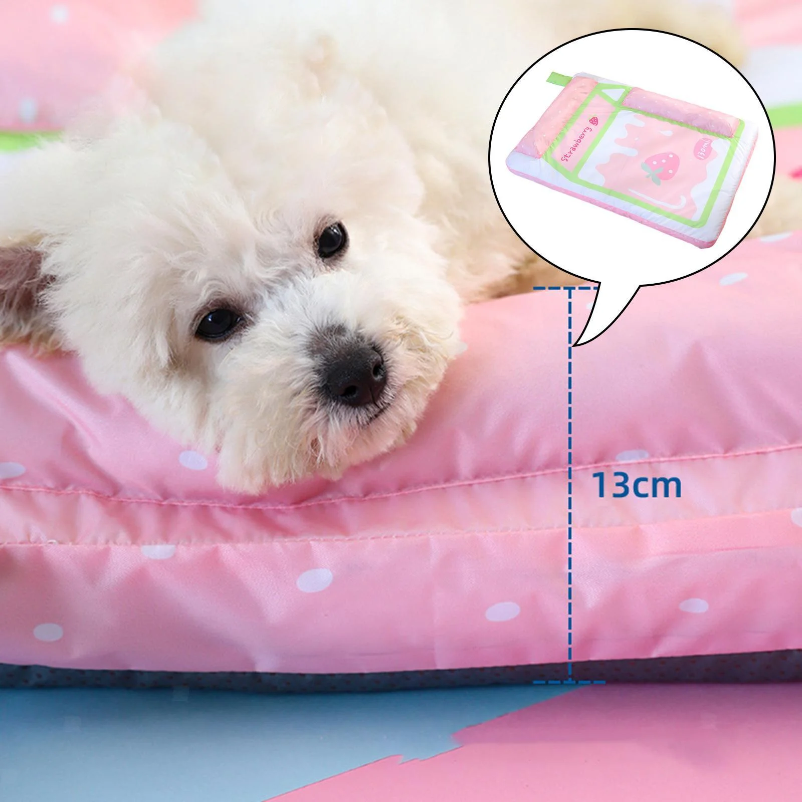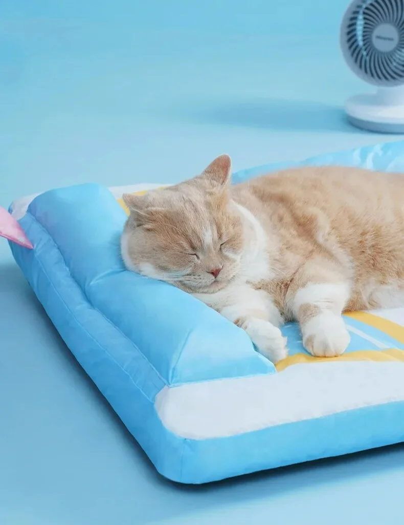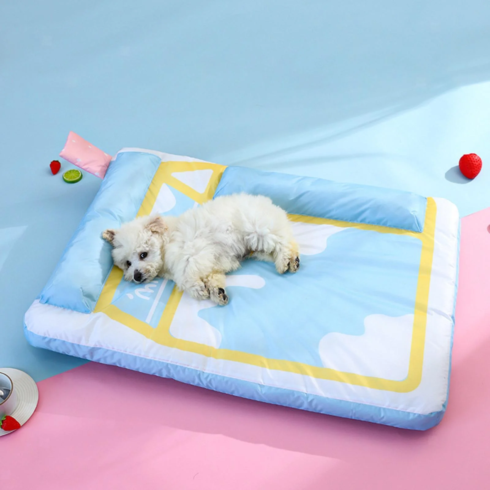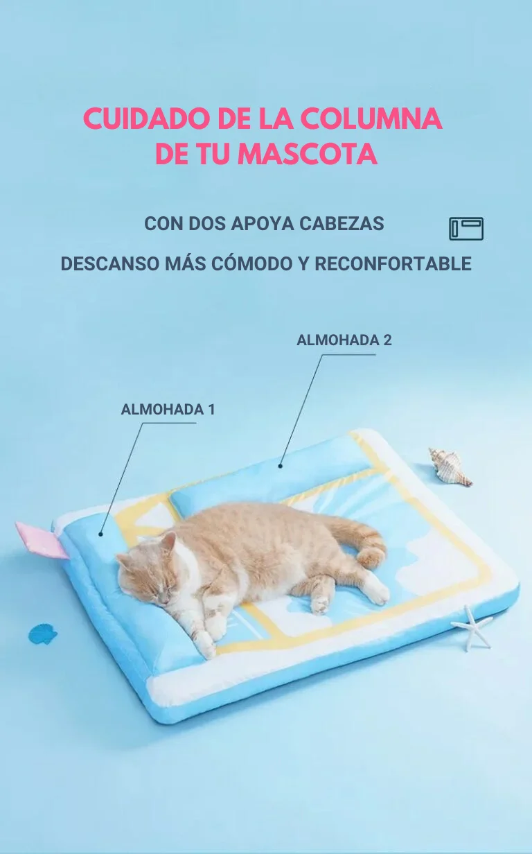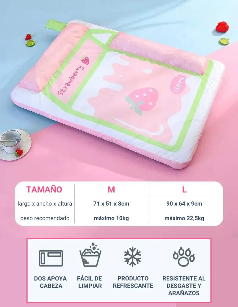 Esta divertida colchoneta con diseño de caja de leche le permitirá a tu mascota dormir de manera confortable durante los días de calor de la primavera y verano. Los dos reposacabezas además de brindar mayor comodidad, protegen las cervicales.