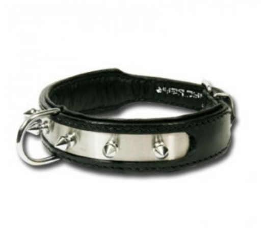 Collar de excelente calidad fabricado en cuero y con una cinta metálica con detalles metálicos como espigas .