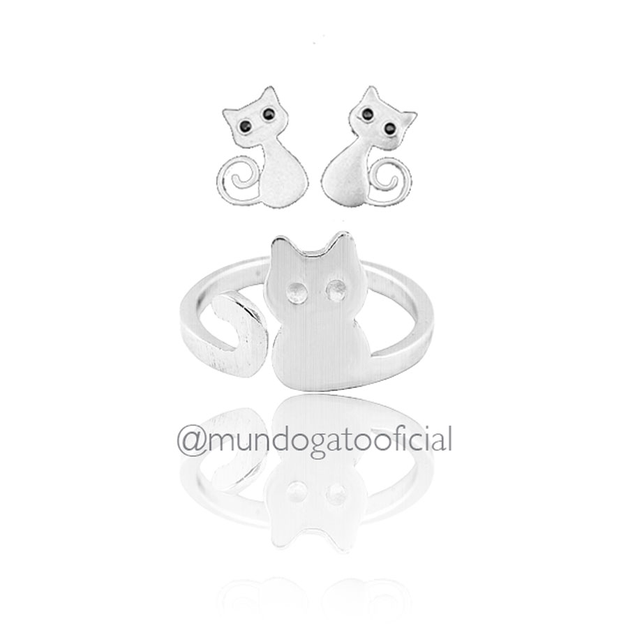 Este conjunto esta conformado por los encantadores pendientes hipoalérgicos de figura de gato y el anillo ajustable con perfil de gato y ojos repujados.