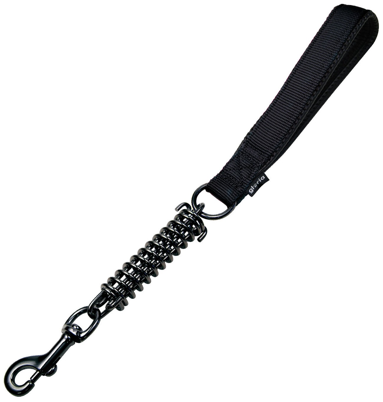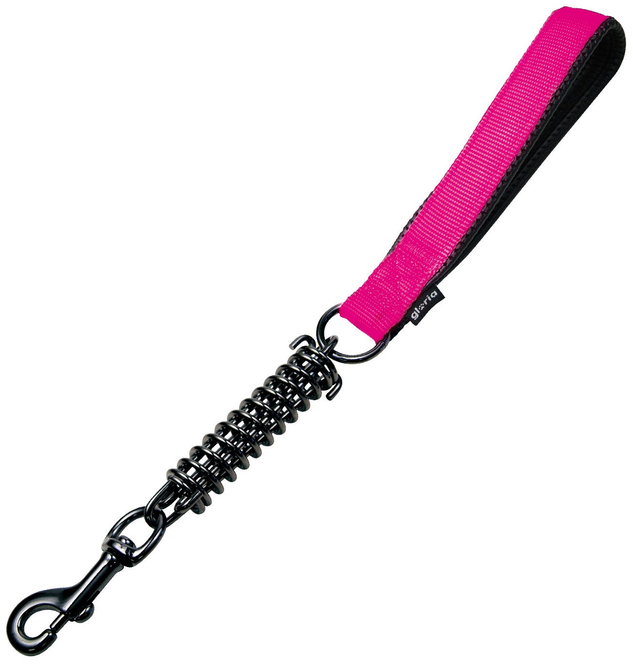 Correa corta para perros con muelle anti tirones de acero cromado negro de alta calidad. Con diseño original de Gloria, esta correa para perros dispone de una cómoda asa de nylon forrado en su enterior de goma para mayo comodidadg Permite tener un adecuado control durante cada paseo. Largo: 41 cm. Grosor: 3 mm. Colores: rojo, azul, negro y rosa.