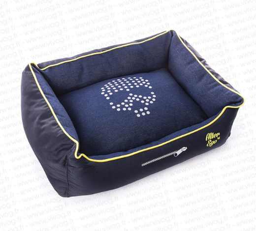 Cesta rectangular azul  con efecto jean. Cojín extraíble . Estampado de calavera . Material: polialgodón.Cuna desenfundable.