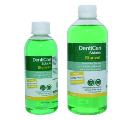DENTICAN SOLUBLE. DENTÍFRICO SOLUBLE Novedosa presentación para la higiene buco-dental de las mascotas. El producto se disuelve cómodamente en el agua de bebida, supliendo la acción directa del cuidador en la higiene bucal diaria de la mascota. Formulado con digluconato de clorhexidina, fluoruro sódico y gluconato de Zinc. Los agentes antibacterianos de Dentican Soluble, le proporcionan una higiene bucal completa, evitando la formación de la placa bacteriana, la aparición del sarro y eliminando el mal aliento. Puede ser usado en perros a partir de 6 meses de edad. Modo de empleo: Diluir 1 tapón de DentiCan Soluble por cada litro de agua de bebida. Cambiar el agua todos los días.