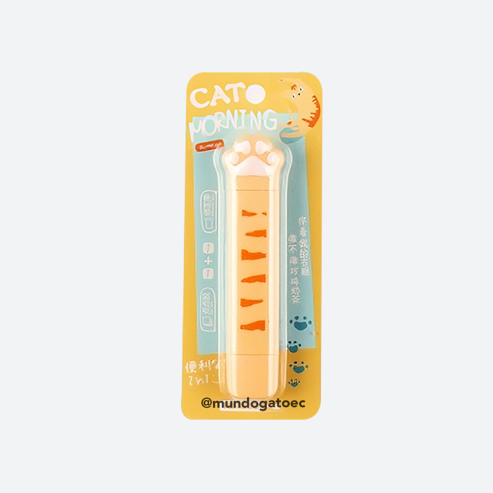 El Duo amarillo de cinta con pegamento y corrector de huellita cuenta con una buena cobertura y fácil modo de uso. Una punta es cinta correctora y la otra es una cinta pegante con el mismo sistema de la cinta correctora, solo debes presionar la punta suavemente y deslizar para aplicar la cinta pegante y con esta podrás pegar tus notas, papeles o detalles de tarjetas. Perfecta para uso de manualidades o en apuntes de colegio, universidad o trabajo