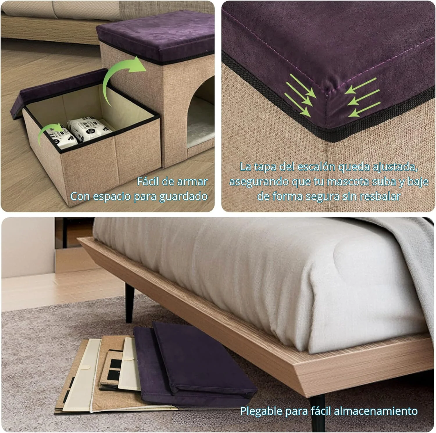 Escalera plegable 3 en 1 para mascotas con baúl y cucha con almohadón (Beige + Violeta)