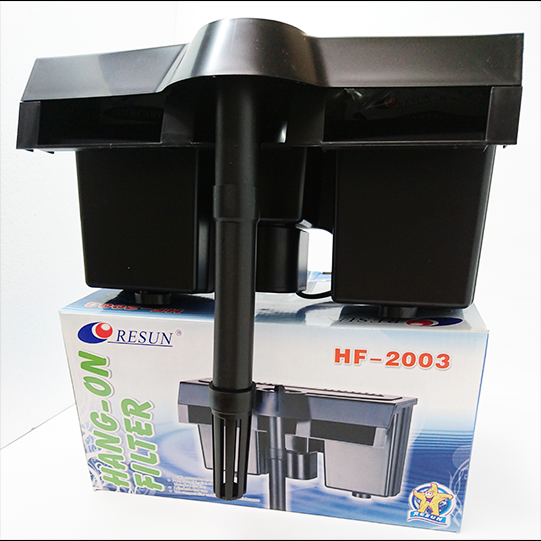 Marca: RESUN • Modelo: HF-2003 • Caudal: 720L/h • Consumo: 7W • Dimensiones: 31 (An) x 16 (al) x 12 (prof) cm • Filtro de cascada o mochila • Doble cámara de filtración • Doble caida de agua • Tornillo de ajuste de balance • Tubo de admisión con malla para proteger peces pequeños • Compatible con acuarios de agua dulce o marinos • Material filtrante de fácil reemplazo • Compatible con acuarios de 45-300L / 12-80Gal • Amplio compartimento interno para alojar filtro biológico (canutillos) y/o químico (carbón activado) • Caudal ajustable mediante perilla en la parte superior • Bajo mantenimiento