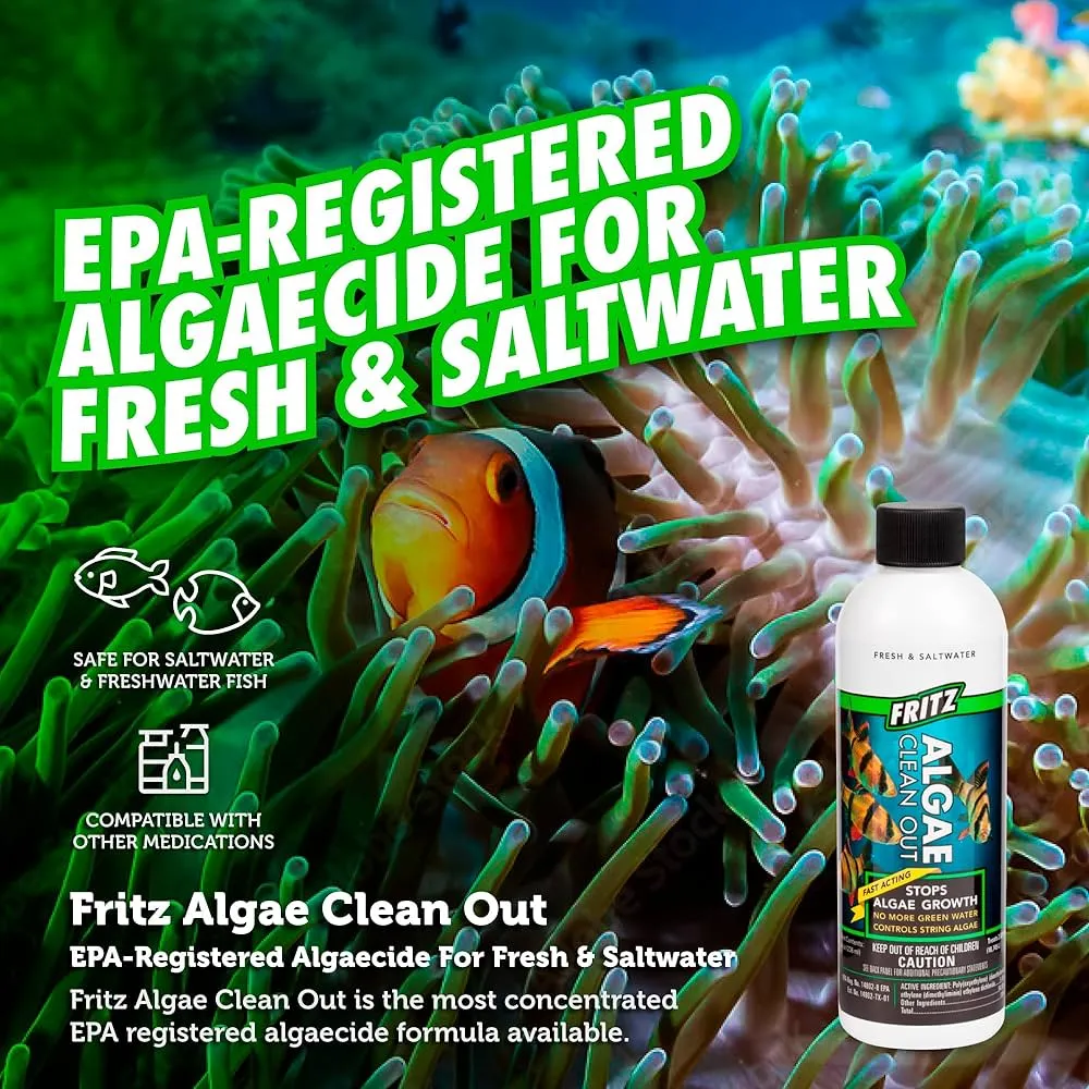 Fritz Algae Clean Out 8oz es eficaz tanto en acuarios de agua dulce como salada, fuentes y estanques pequeños.
