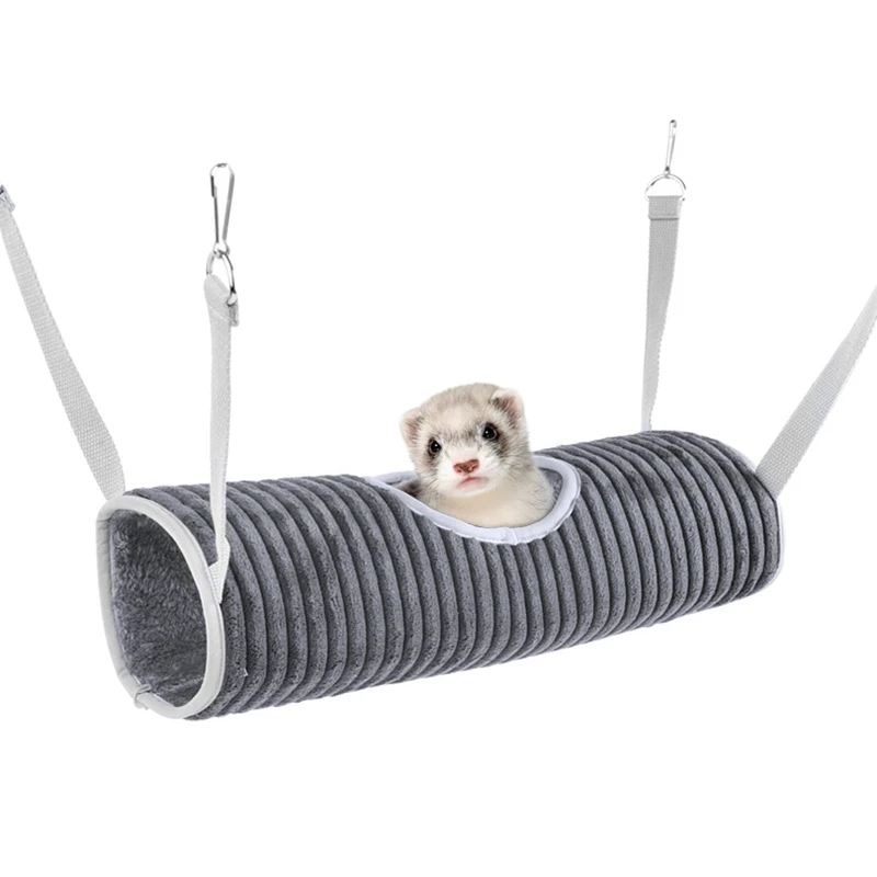 Cama tipo túnel colgante con cómoda franela suave para animales pequeños.