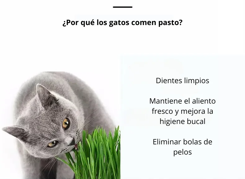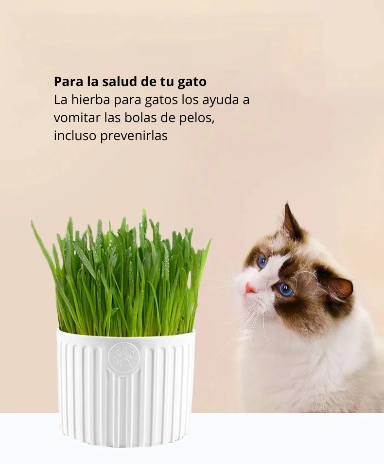 Kit para preparar pasto con semillas y tierra incluídas. El pasto es ideal para beneficiar la salud de los gatos, los ayuda a prevenir y vomitar las bolas de pelos, ayuda en su higiene oral además de mejorar el aliento. Aproximadamente en una semana tu gatito podrá disfrutar de su pasto, lo ideal es colocarlo en lugar con sol y ventilación.