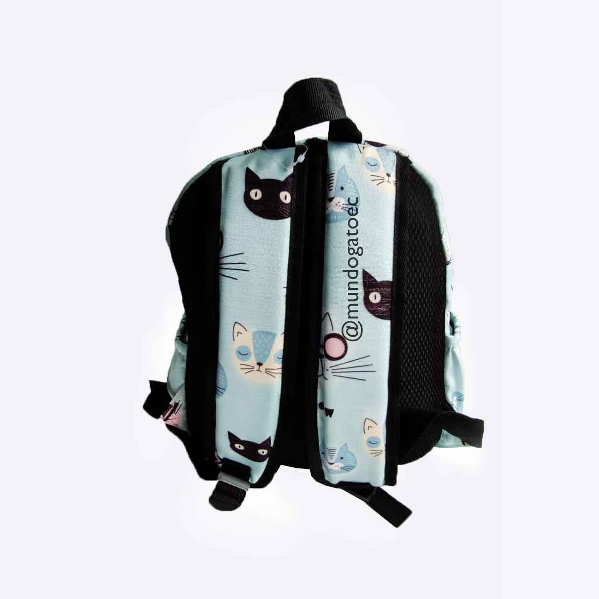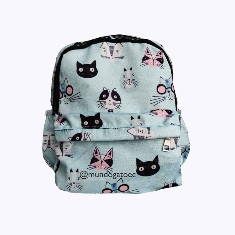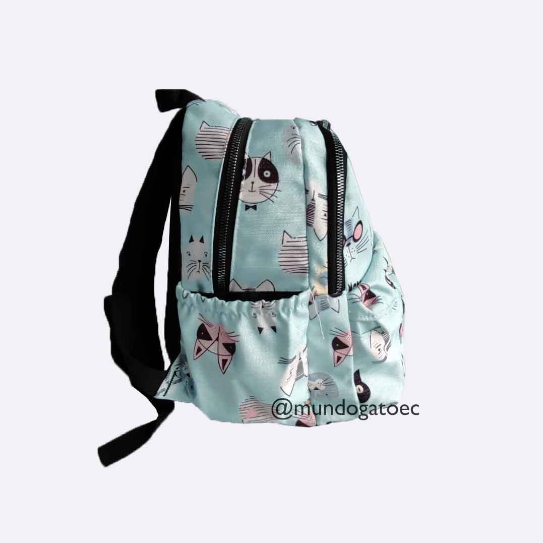 Esta hermosa y resistente mochila en color celeste y con diseño diseño de gatos y con brillos sutiles incluídos en su tramado te ayudará para viajes, estudios y situaciones donde necesites una mochila con un tamaño pequeño pero de gran capacidad!