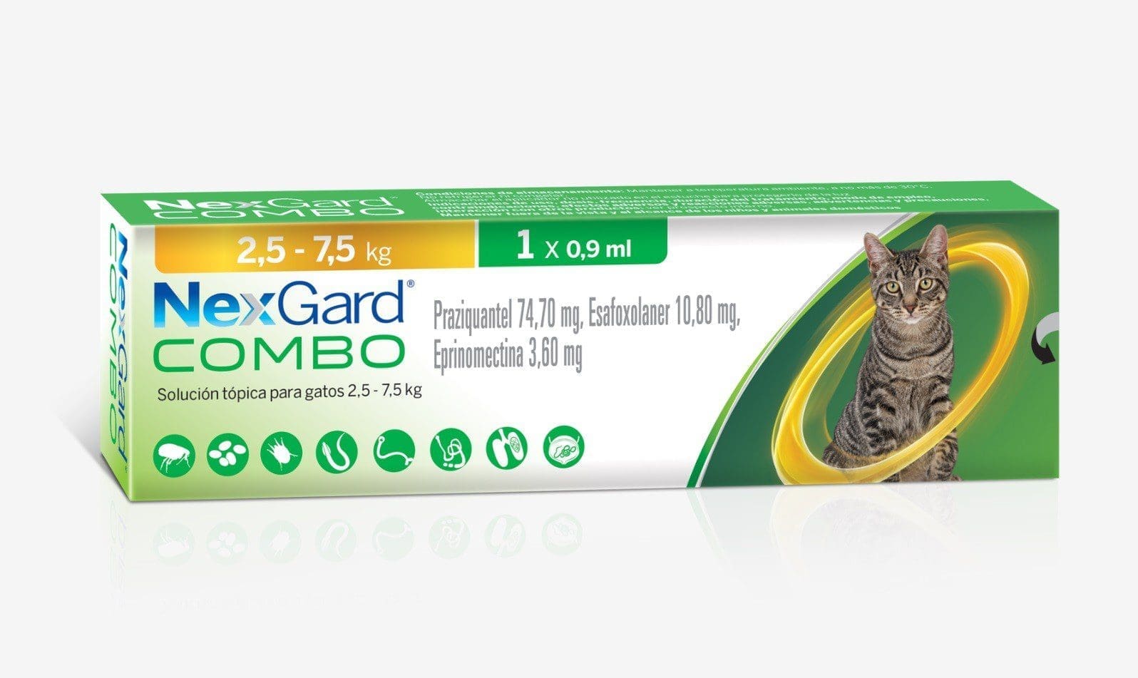 NexGard® COMBO Solución tópica cuya absorción transdérmica proporciona una eficacia sistémica Incorpora un aplicador cómodo y preciso que ayuda a reducir el estrés de gato y dueño, y favorece el cumplimiento terapéutico. Se comercializan dos presentaciones de tres aplicadores: Gatos de menos de 2,5 kg Gatos de 2,5 a 7,5 kg