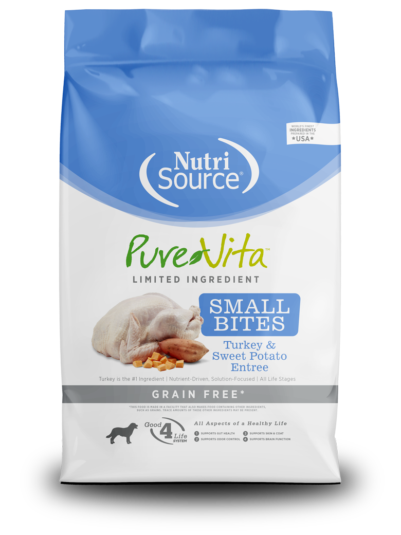 Nutrisource Pure Vita Small Bites Turkey & Sweet Potato Entrée ofrece nutrición limitada en ingredientes con croquetas pequeñas para una mejor masticación. Ideal para perros adultos de razas pequeñas y medianas, sensibles a los granos o con alergias alimentarias.