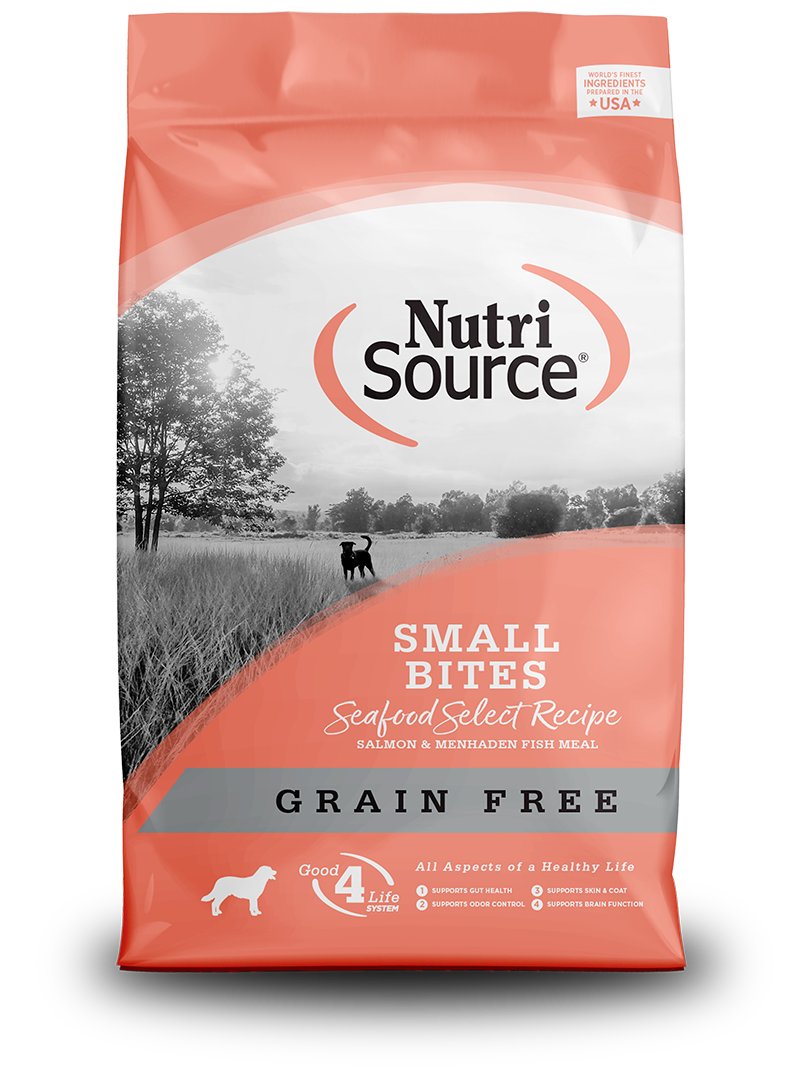 Nutrisource Small Bites Seafood Selects Grain Free es un alimento premium sin granos, diseñado con croqueta pequeña para perros adultos de razas pequeñas o con dificultad para masticar. Contiene proteína de mariscos de alta calidad y es ideal para estómagos sensibles.
