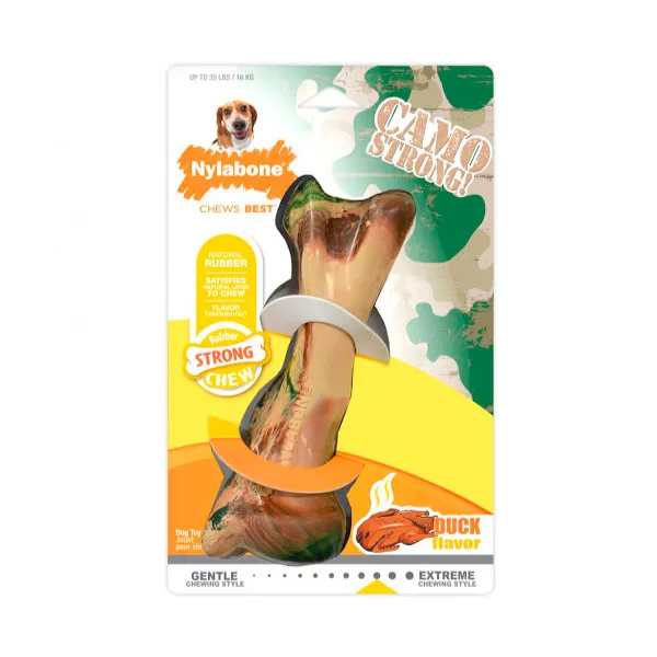 ¡Los perros fuertes necesitan juguetes para masticar resistentes! Nuestro Strong Chew Camo Bone está hecho con caucho natural para satisfacer la necesidad natural de masticar de su perro. ¡Este fuerte juguete para masticar presenta un diseño de camuflaje único y contiene un delicioso sabor a pato que adoran los perros! Además, su patrón de masticación texturizado ayuda a limpiar los dientes y refrescar el aliento para un mejor cuidado dental.