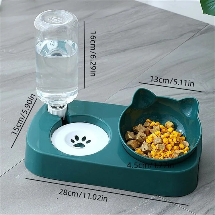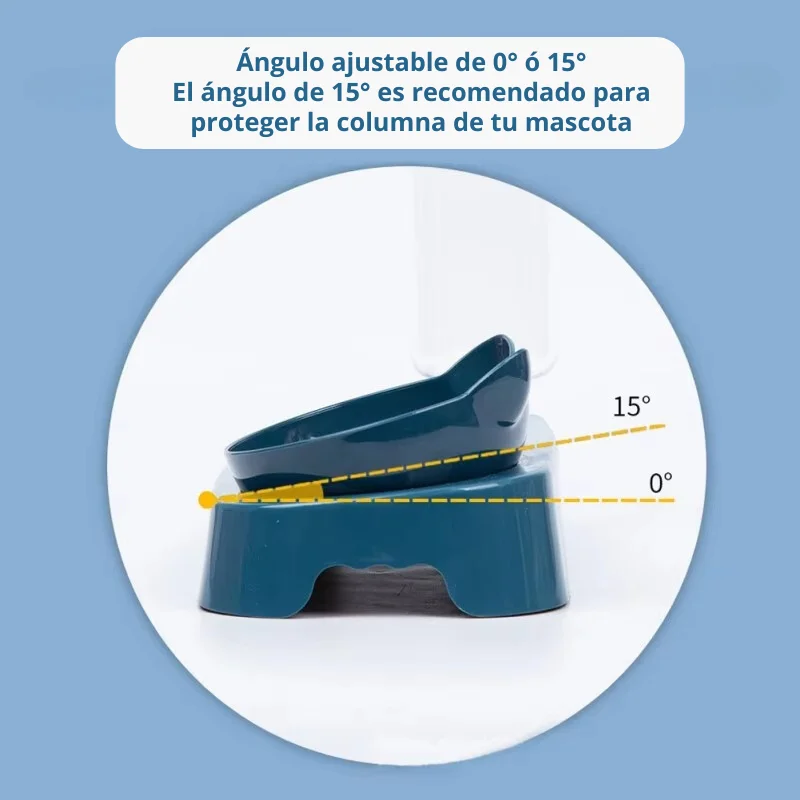Plato doble con base con altura e inclinación de 15° que ha sido cuidadosamente diseñado para mejorar la postura de alimentación de nuestras mascotas mimadas, reduciendo la compresión de la columna vertebral causada por inclinarse y preservando la salud de su espalda. Incluye botella de 500ml para mantener el bebedero lleno por gravedad. El plato se extrae fácilmente para una adecuada limpieza.