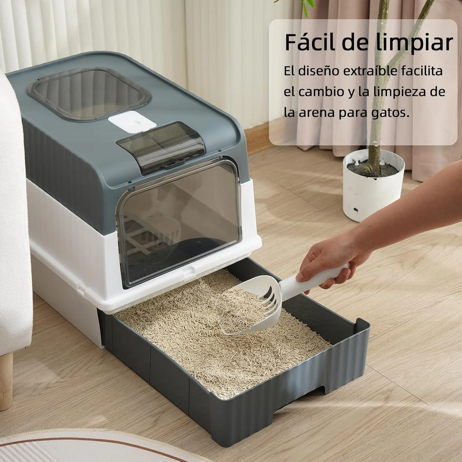 Sanitario cerrado para gatos que previene el derrame de las piedras sanitarias. De muy fácil armado. Con puerta basculante que permite el ingreso y con salida superior. La bandeja de gran capacidad (4,5kg) se extrae completamente para facilitar su limpieza. Incluye bolsita desodorizante y pala.