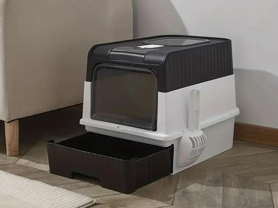 Sanitario cerrado para gatos que previene el derrame de las piedras sanitarias. De muy fácil armado. Con puerta basculante que permite el ingreso y con salida superior. La bandeja de gran capacidad (4,5kg) se extrae completamente para facilitar su limpieza. Incluye bolsita desodorizante y pala.