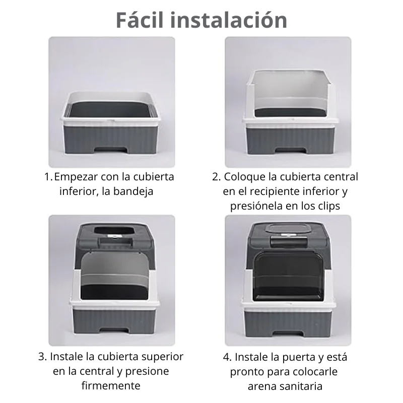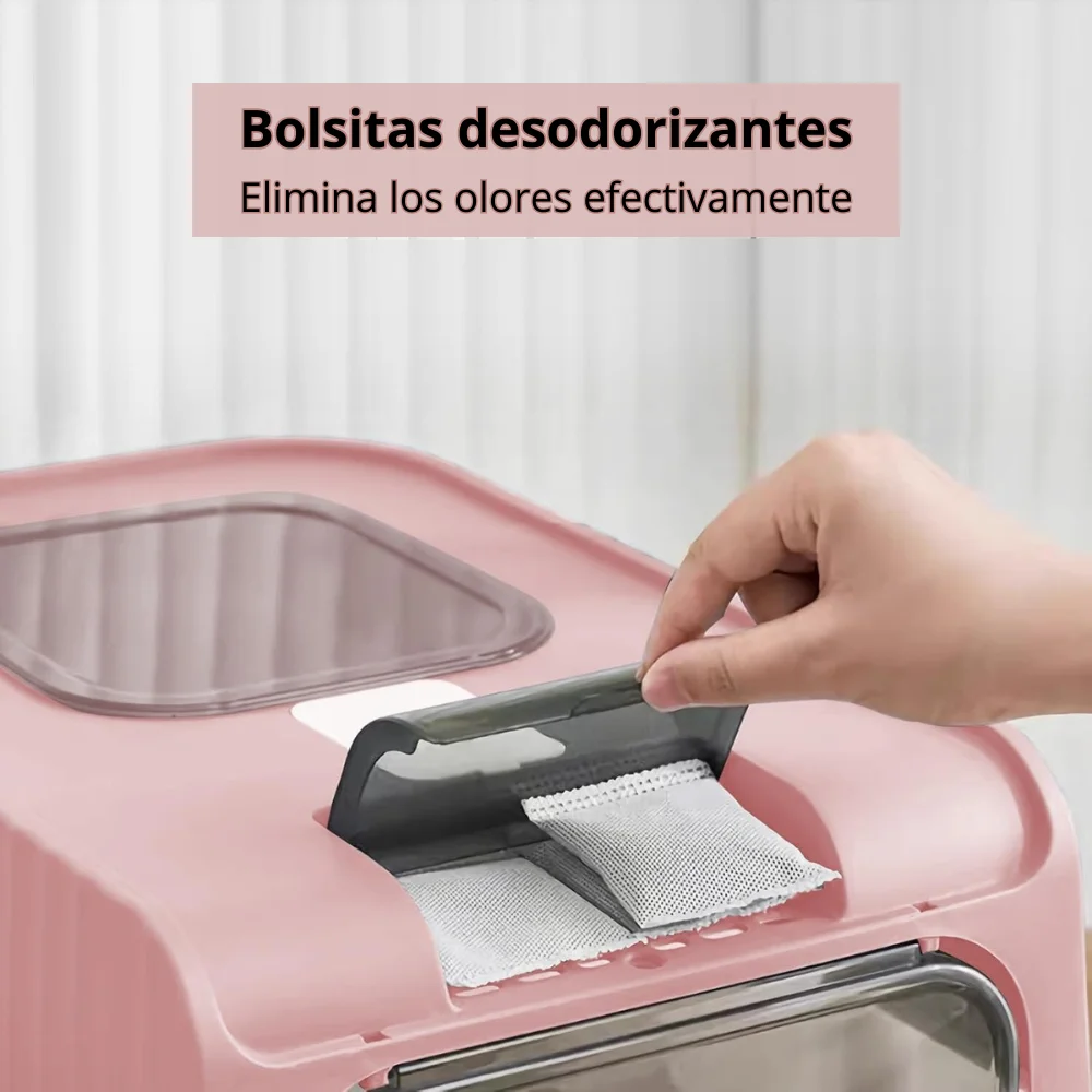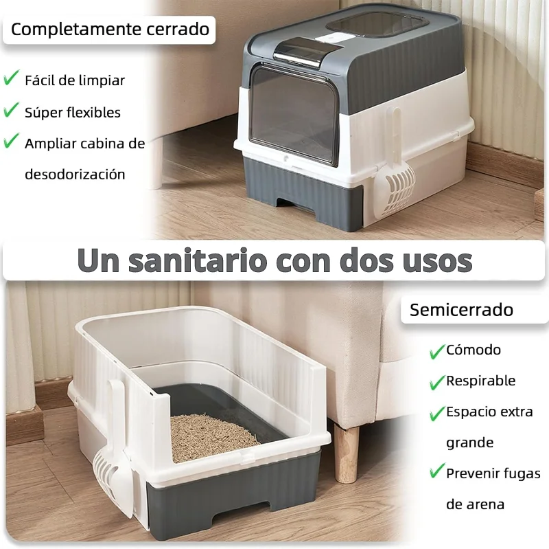 Sanitario cerrado para gatos que previene el derrame de las piedras sanitarias. De muy fácil armado. Con puerta basculante que permite el ingreso y con salida superior. La bandeja de gran capacidad (4,5kg) se extrae completamente para facilitar su limpieza. Incluye bolsita desodorizante y pala.