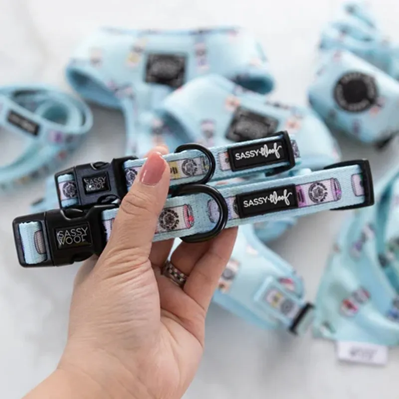El collar azul para perro moderno de la colección Sassy Woof Seltzer es la opción ideal para quienes buscan un accesorio funcional, cómodo y con mucho estilo para su mascota. Su diseño colorido y divertido está inspirado en las latas de bebidas gasificadas, dándole un toque fresco y original al paseo diario de tu peludo.