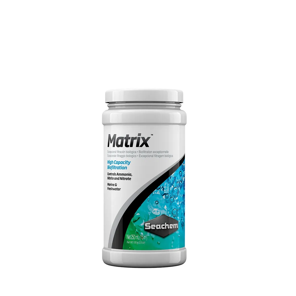 Matrix ™ Biofiltración de alta capacidad. Controla amoníaco, nitrito y nitrato. Altamente poroso: área de superficie enorme (> ~ 700 m 2 / L) Soporta especies de bacterias aerobias y anaerobias. Matrix ™ es una biomedia de alta porosidad que proporciona una biofiltración eficiente para la eliminación de desechos nitrogenados. Matrix ™ es un sólido inorgánico poroso de aproximadamente 10 mm de diámetro. ¡Cada litro de Matrix ™ proporciona tanta superficie (> ~ 700 m 2 ) como 170 litros de bolas de plástico! Los materiales biológicos plásticos solo proporcionan un área de superficie externa, mientras que Matrix ™ proporciona un área de superficie macroporosa externa e interna. Estos macroporos tienen un tamaño ideal para el apoyo de las bacterias nitrificantes y desnitrificantes. Esto permite que Matrix ™, a diferencia de otras formas de biomedia, elimine el nitrato junto con el amoníaco y el nitrito, simultáneamente y en el mismo filtro. Matrix ™ es completamente inerte y no se descompone. No necesita ser reemplazado. Como la mayoría de las bacterias son internas, Matrix ™ puede enjuagarse cuando sea necesario sin dañar el filtro. Matrix ™ es compatible con todos los tipos de filtros húmedos o secos. Use 250 ml de Matrix ™ por cada 200 l (50 galones de EE. UU.) ** de agua. Matrix ™ puede colocarse en cualquier tipo de filtro, y es particularmente efectivo en un filtro de bote. Matrix ™ es lo suficientemente grande como para que no se requiera bolsa de filtro para la mayoría de las aplicaciones. Matrix ™ funciona bien en los sistemas de bandejas de goteo, pero puede encontrar que Pond Matrix ™ más grande es más adecuado para tales aplicaciones. Úselo con Stability® para establecer más rápidamente el biofiltro. ** Esta dosis puede diferir de su envase. Sobre la base de estudios actualizados, hemos encontrado que Matrix ™ trata incluso más agua de lo que se afirma anteriormente. Tamaños: 100 ml, 250 ml, 500 ml, 1 l, 2 l, 4 l