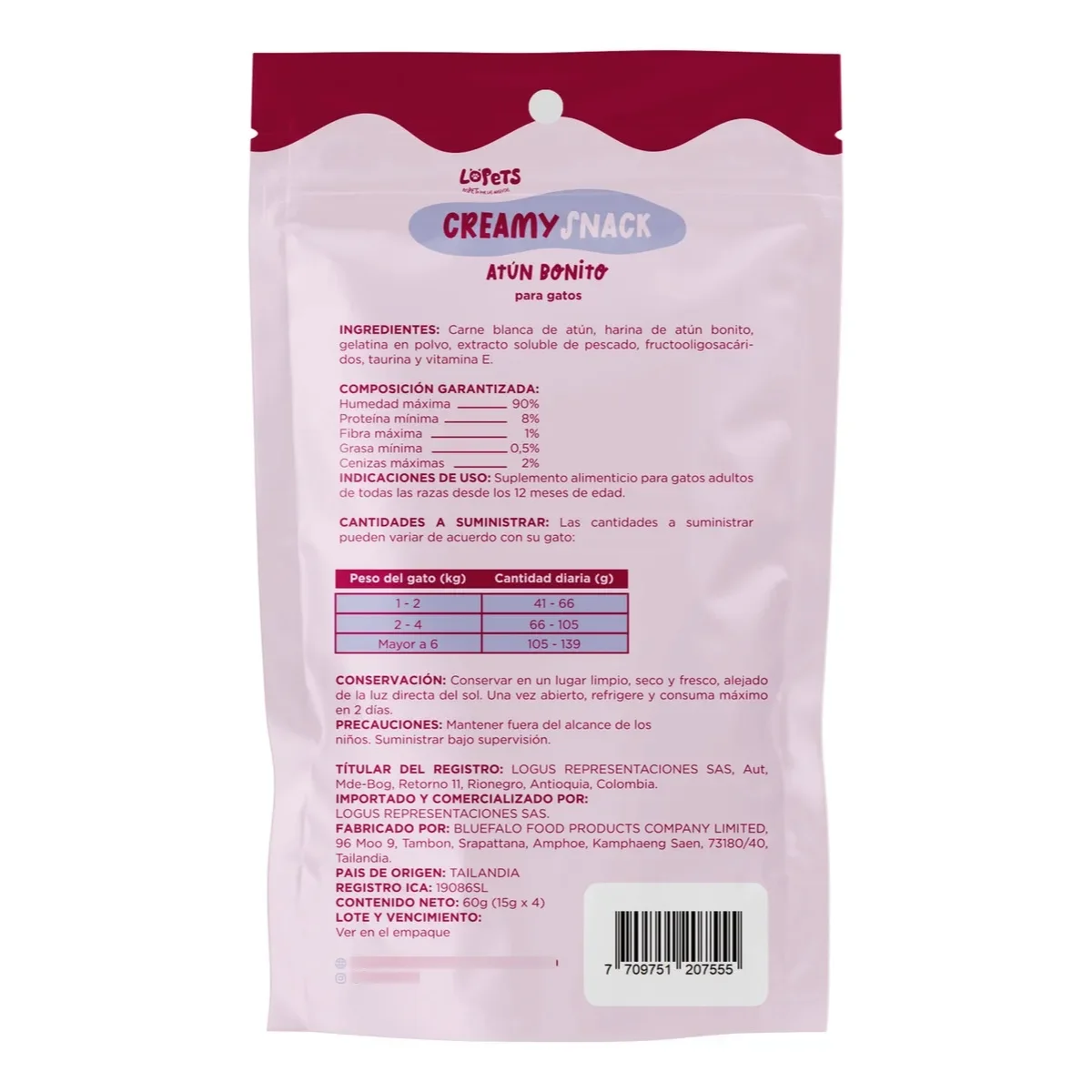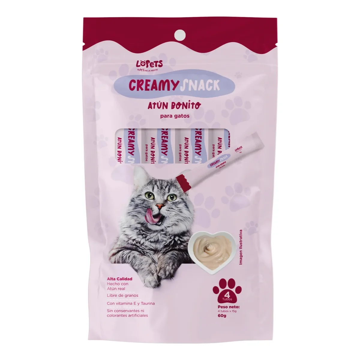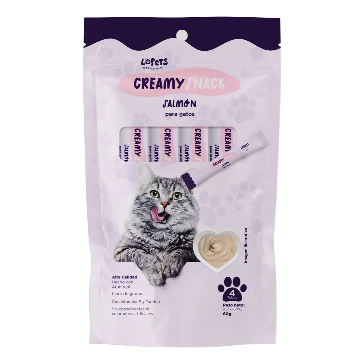 Los snack de Lopets son un premio delicioso y cremoso de alta calidad. Contienen Atún real, Vitamina E y Taurina. Son libre de granos, sin conservantes ni colorantes artificiales. Es perfecto para servir solo o para mezclar con su alimento seco diario.