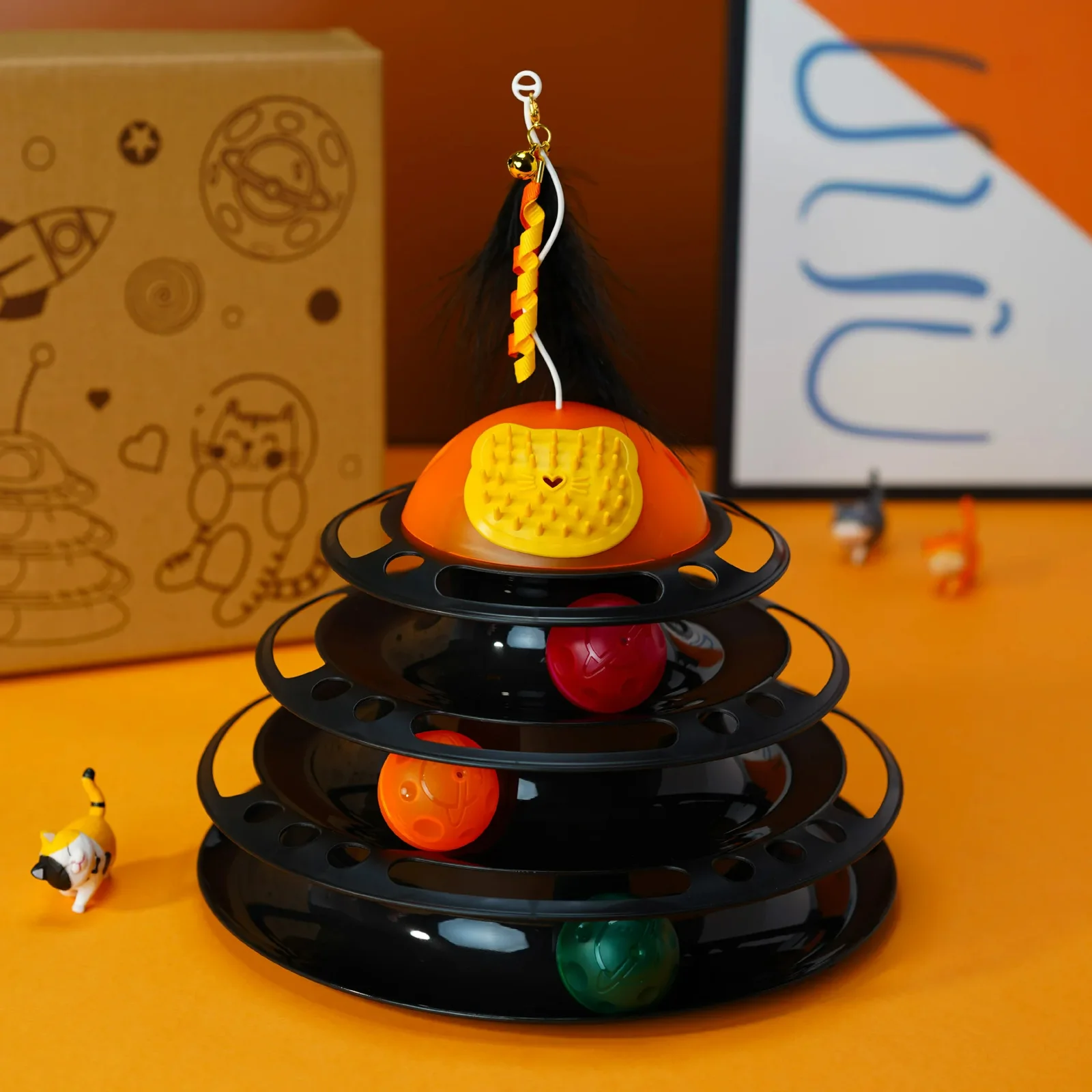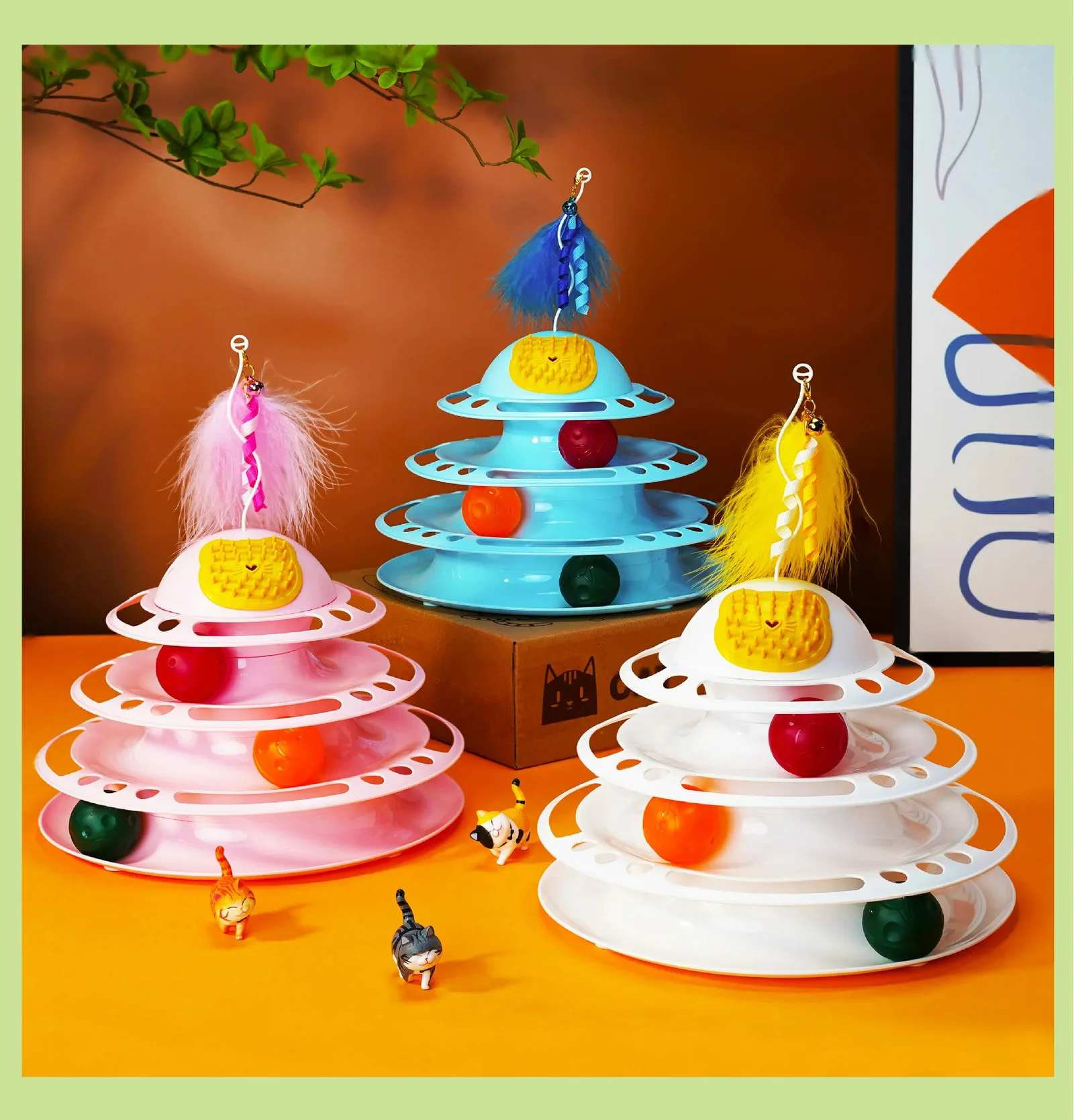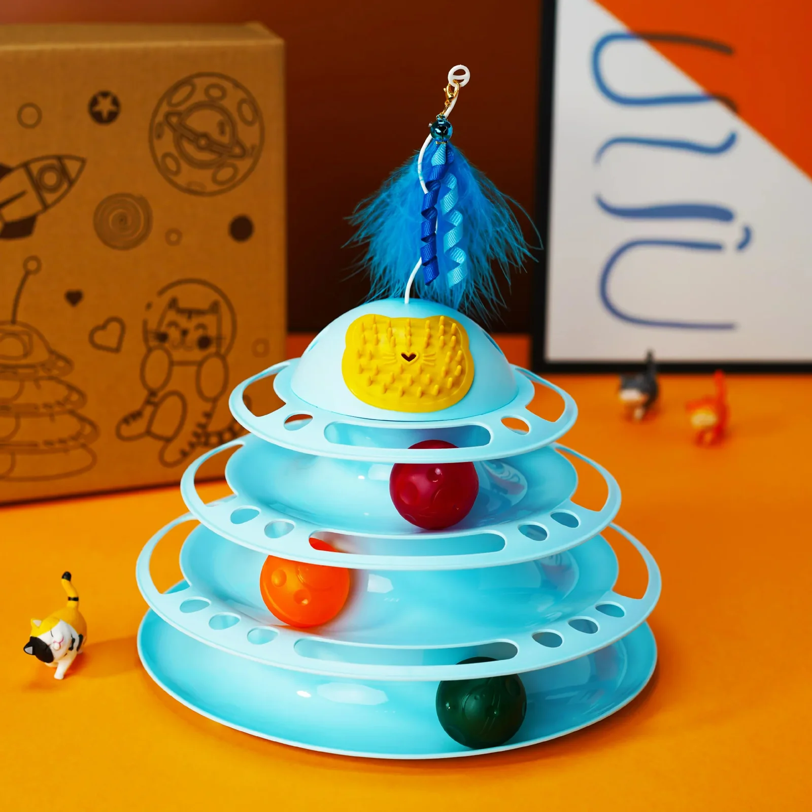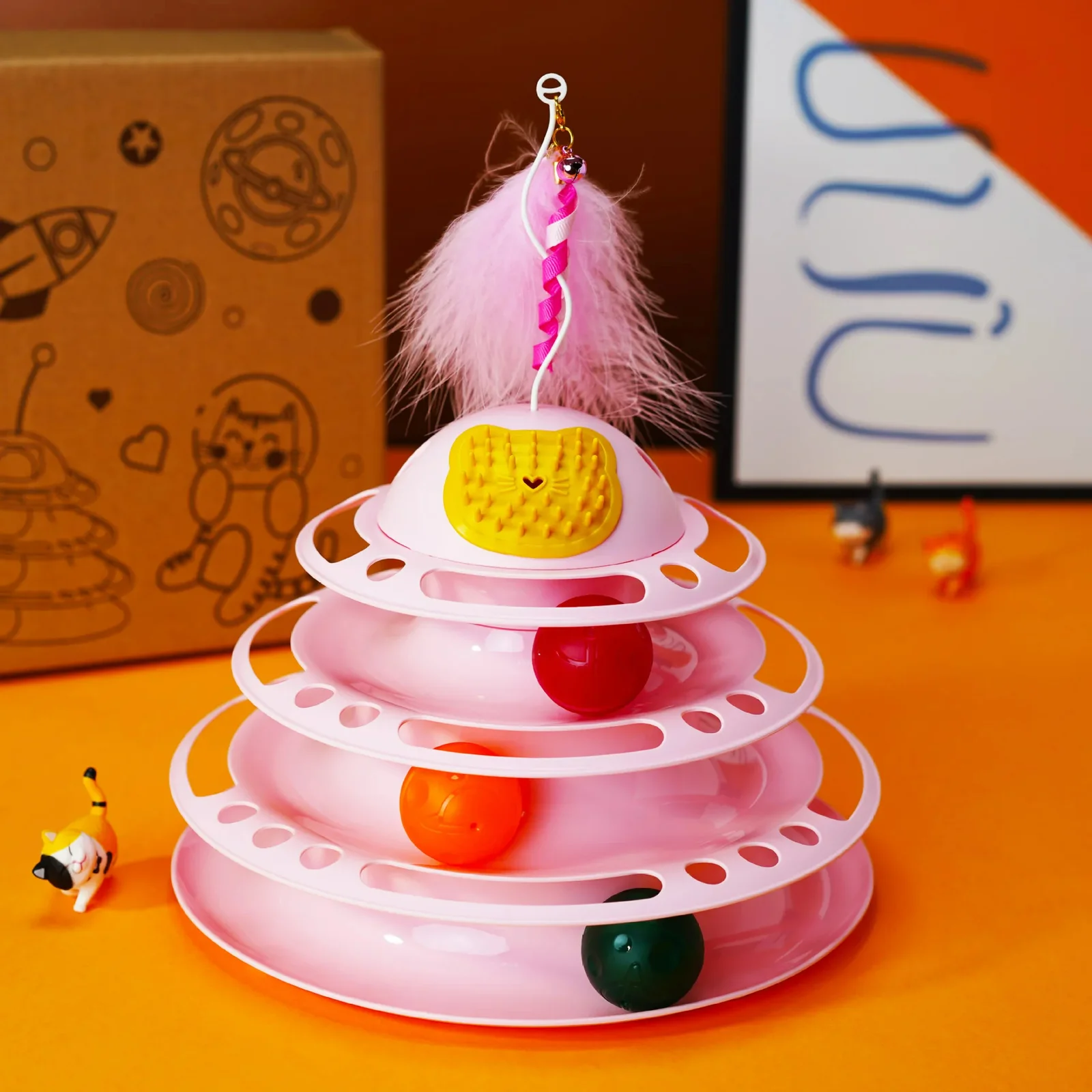 Es extra divertido y perfecto para uno o varios gatos jugar interactivamente. Las pelotas rodarán alrededor de las pistas manteniendo a tus gatos ocupados y entretenidos. Cuenta con 3 pistas con 4 pelotas, plumas y un compartimiento para yerba gatera en la parte superior.