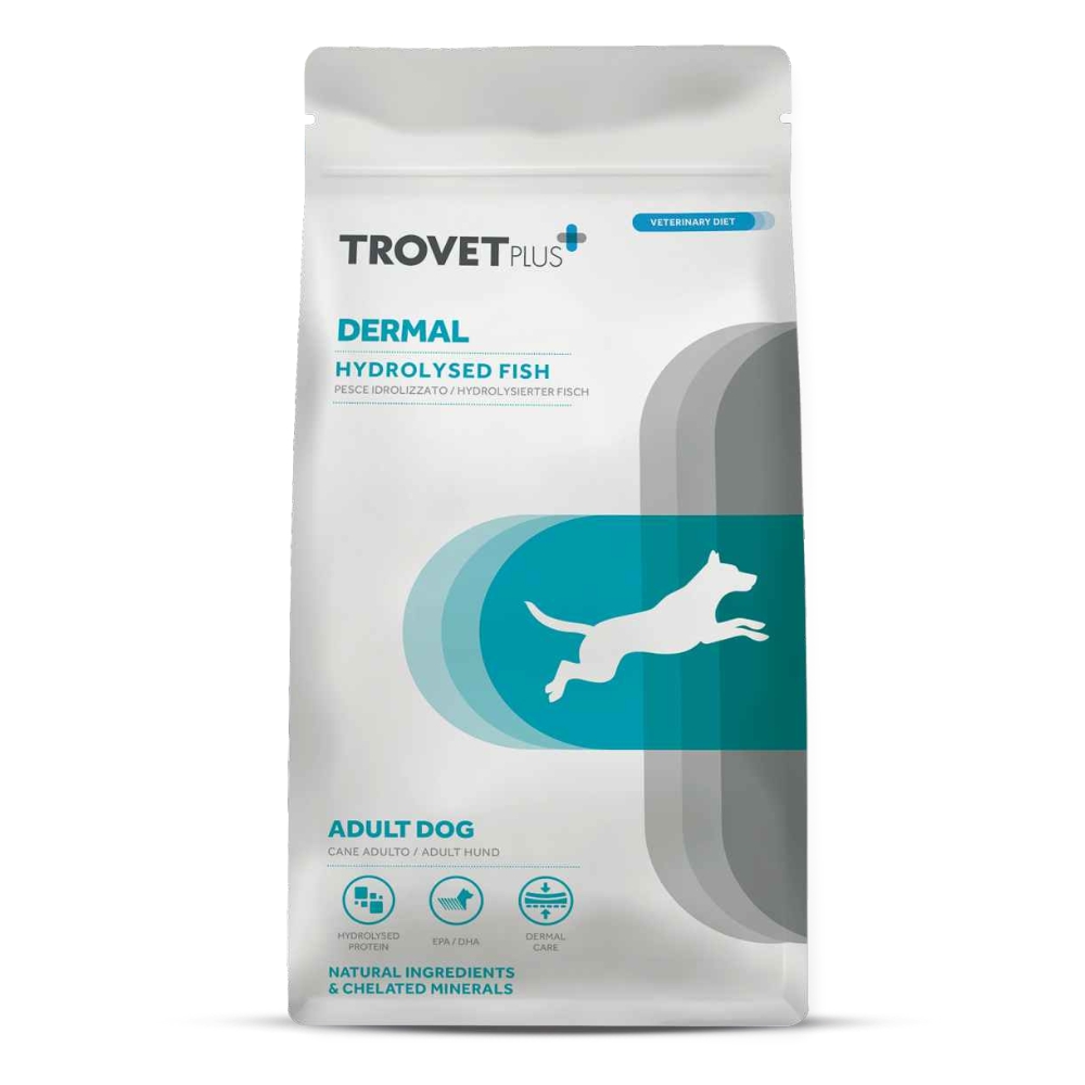 Alimento dietético completo para perros adultos, indicado para la reducción de la intolerancia a ingredientes y nutrientes y mantenimiento de la función dérmica en caso de dermatosis y pérdida excesiva de pelo.
